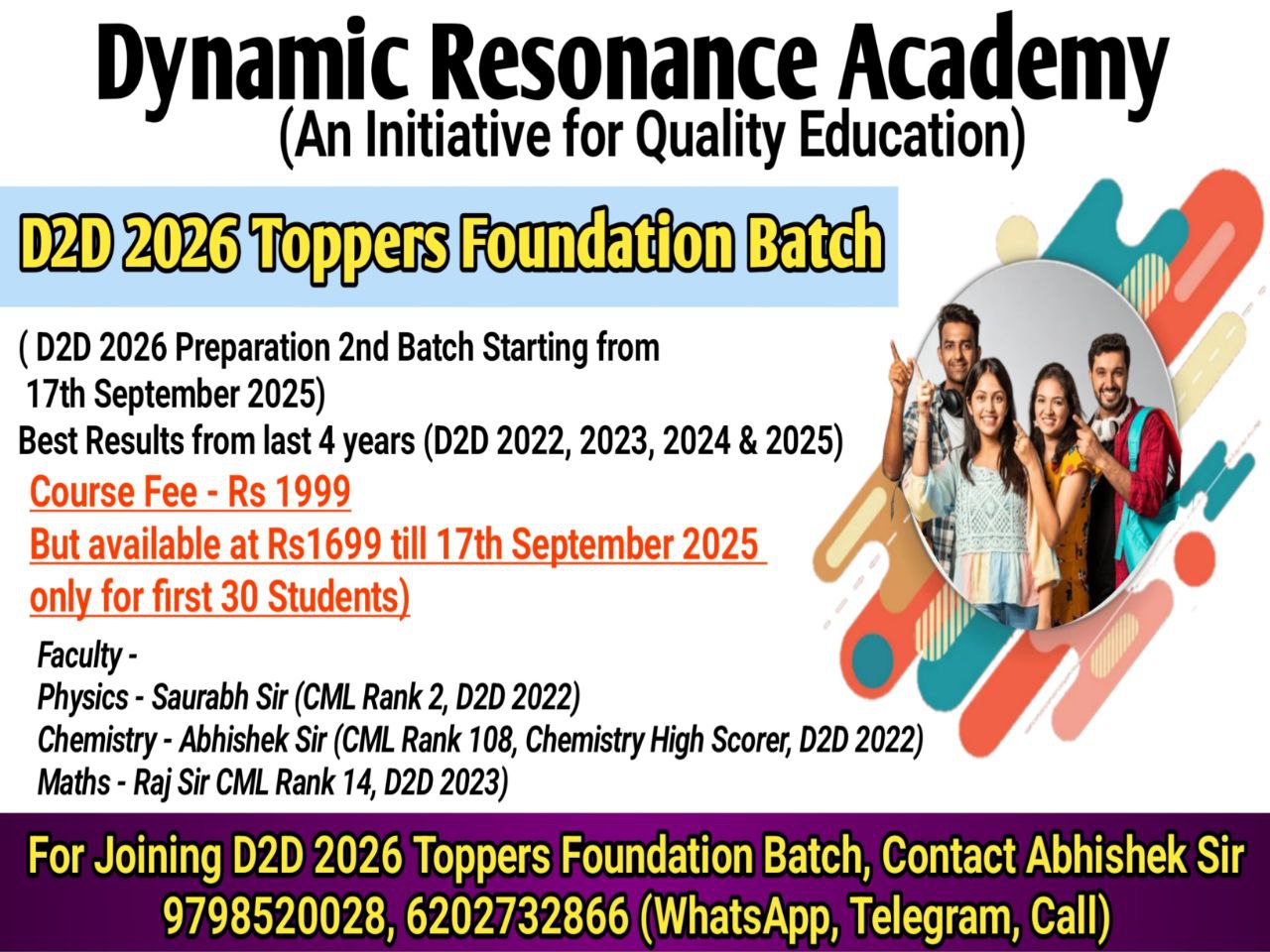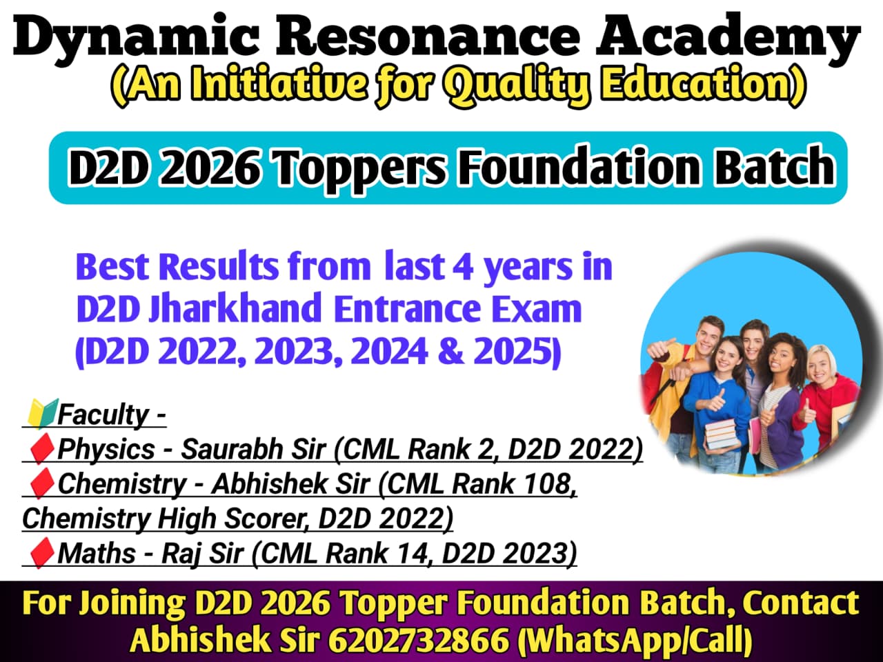 In this course, we will cover complete D2D latest syllabus of Physics, Chemistry, Maths. We teach at the best level so that our students got best results in D2D 2022, D2D 2023 and D2D 2024. Here all Faculty are BITians. Faculty are B.Sc Honours, State toppers and high scorers of D2D Jharkhand. Join now and start your preparation journey of D2D Jharkhand for getting best ranks among toppers.